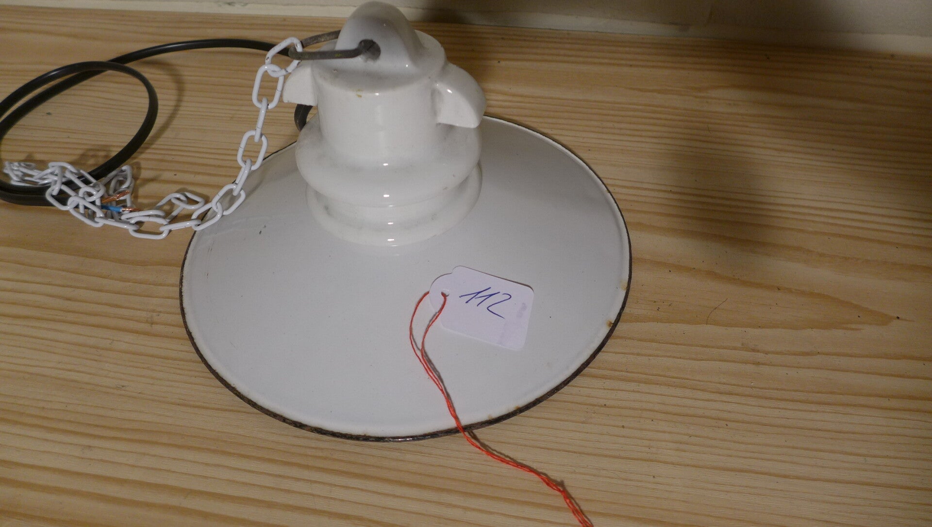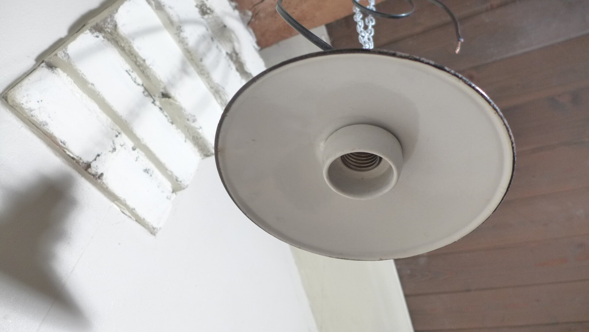 Der Lampenschirm aus weißem Email ist nicht nur ästhetisch ansprechend, sondern auch langlebig. Die charmanten Gebrauchsspuren erzählen von ihrer Geschichte und verleihen ihr einen unverwechselbaren Charakter.