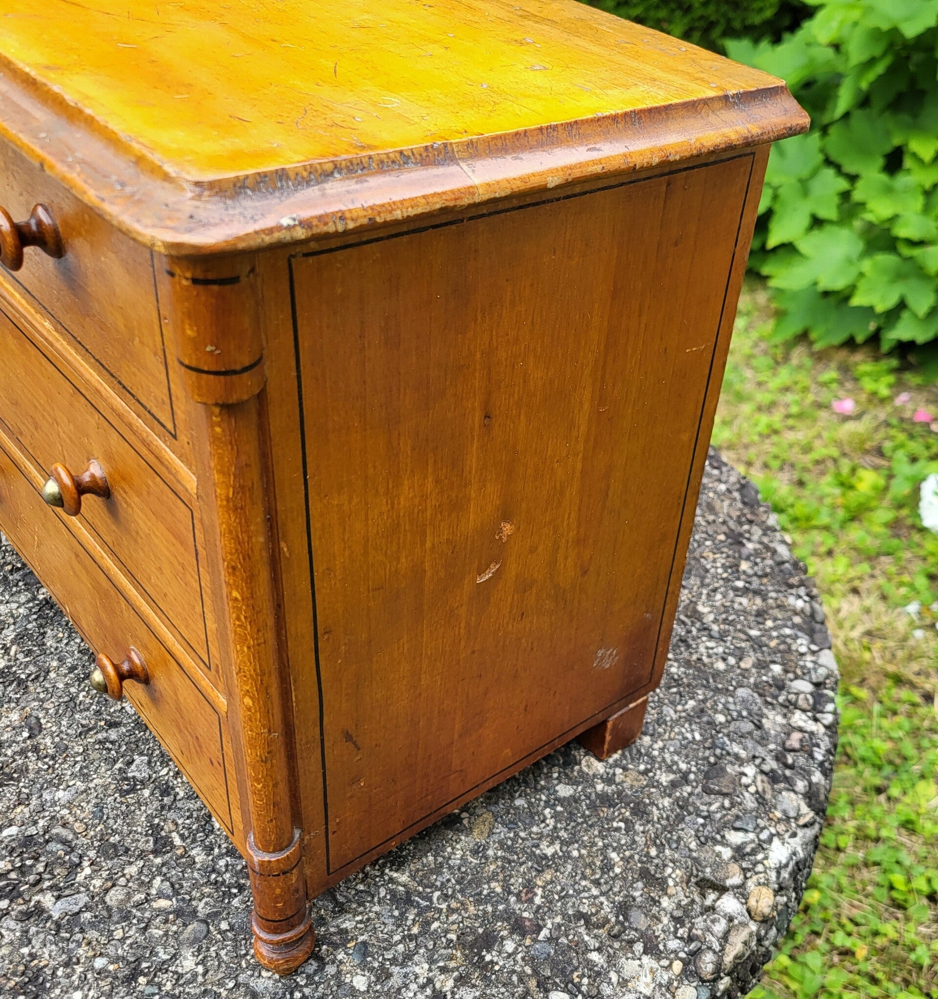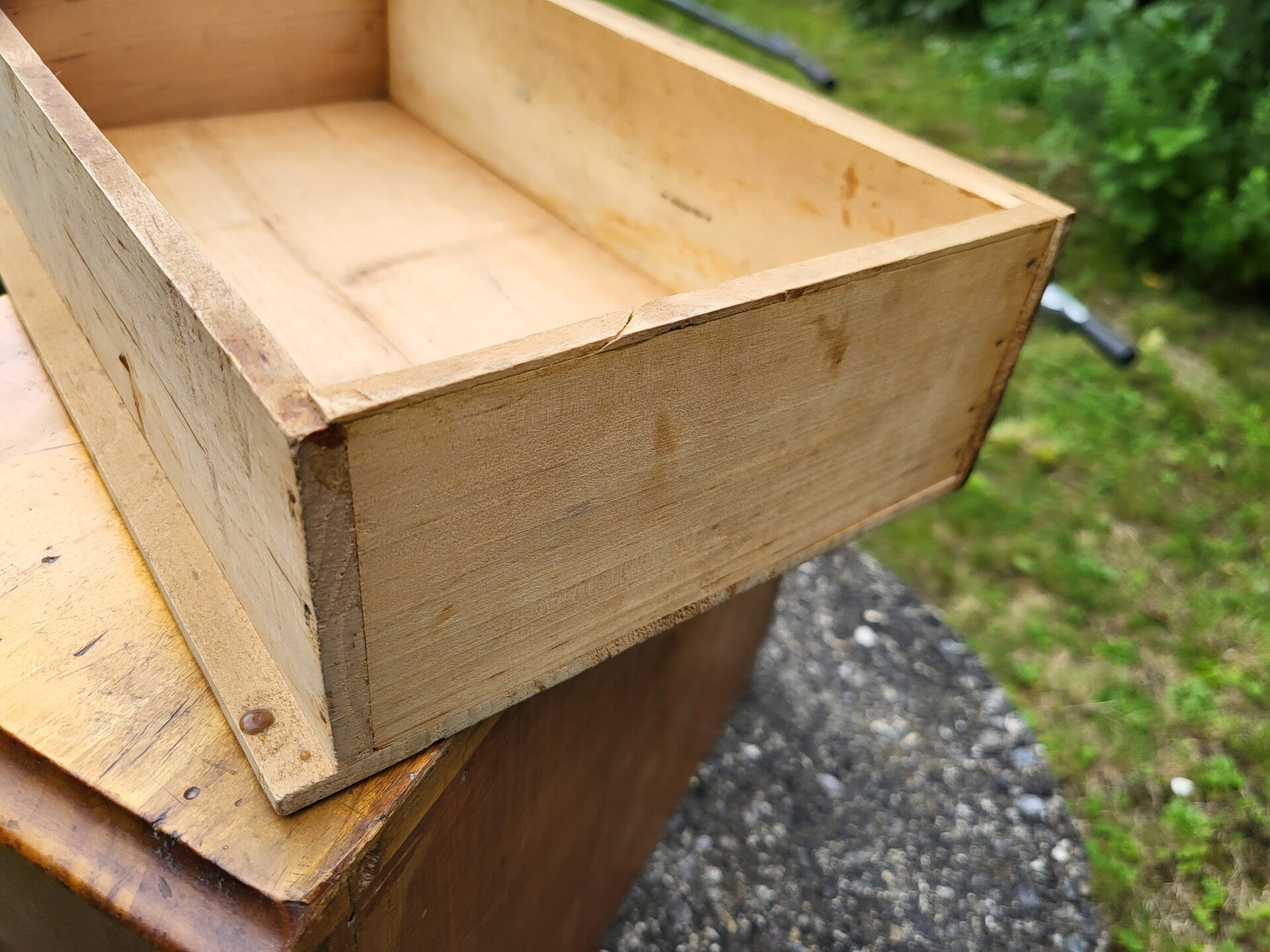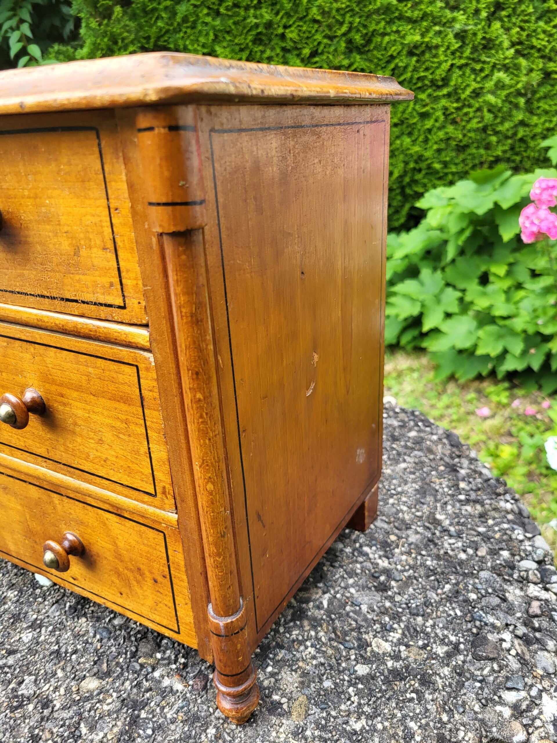 antike Modell Kommode um 1870/80. Die Kommode ist aus massiv Holz. Keine Furniere drann. Holzart Ahorn. Der originale Lack ist mit der zeitgenössischer Verzierung noch drann.