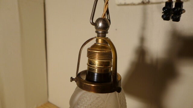 Die Lampe ist mit einer Fassung E27 ausgestattet und wurde mit einem neuen Ketten- und Stoffkabel versehen, um sowohl Sicherheit als auch ästhetischen Genuss zu gewährleisten.
