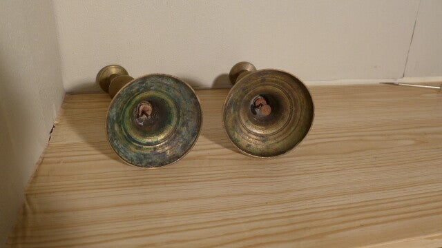 Obwohl sie das Altersspuren an Schrauben und Gewinden aufweisen, sind die Kerzenständer in einem bemerkenswert guten Zustand. Sie strahlen eine nostalgische Atmosphäre aus und eignen sich ideal für besondere Anlässe oder den täglichen Gebrauch.