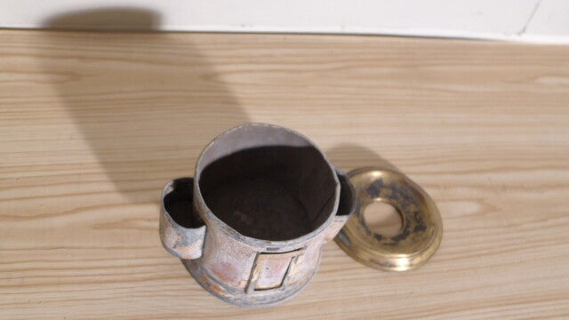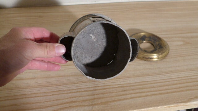 Dieser antike Aschenbecher aus Metall besticht durch seine rare und zeitlose Optik. Der abnehmbare Messingring erleichtert das Entleeren und sorgt für einen eleganten Look.